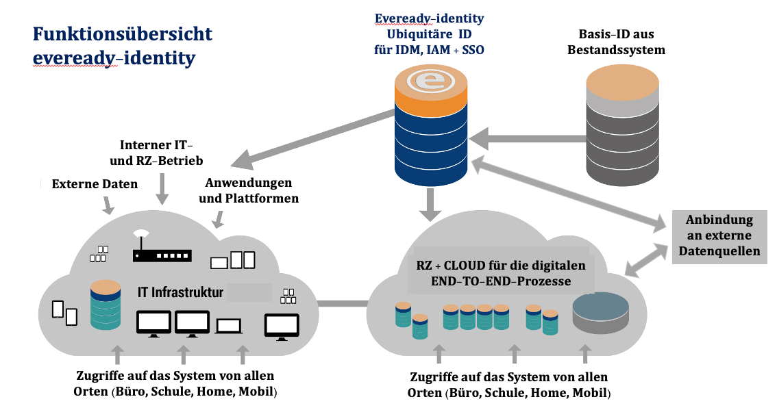 Durch eveready-identity vermeiden Sie Fehler in Ihrer Berechtigungsstruktur und schaffen ein effizientes Benutzer-management. eveready-identity regelt und verwaltet Informationen einzelner Nutzer, Anwendungen und deren Relationen untereinander. eveready-identity leitet Identitäten und deren Berechtigungen innerhalb Ihres IT-Netzwerks und erhöht Prozesse der Datenerfassung und des Datenabgleichs.